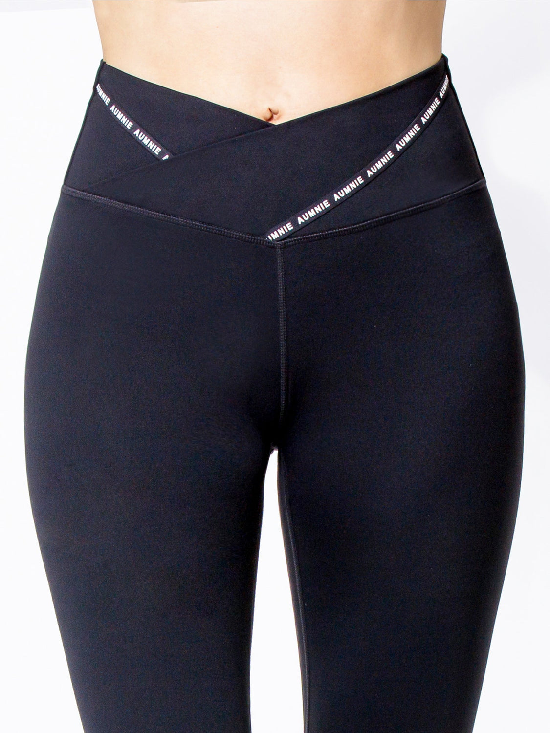 Wrap over waistband with logo straps to accentuate and taper waistline